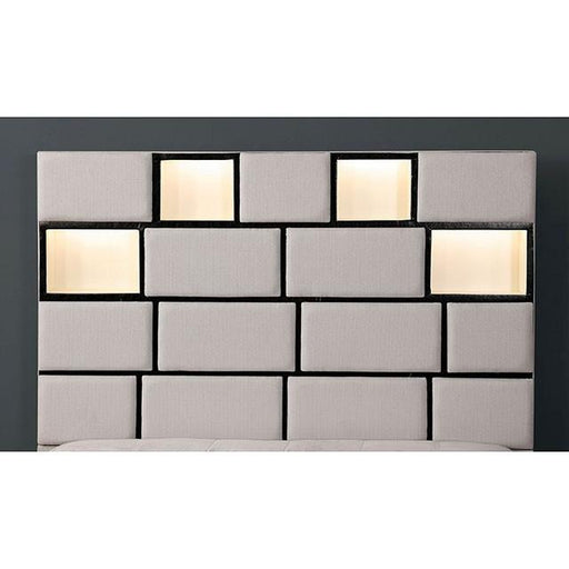 FOA EastGemma Beige/Black Cal.King Bed This is an absolutely dazzling bed. The sectional panels up fabric upholstering make for an unforgettable visual, an...