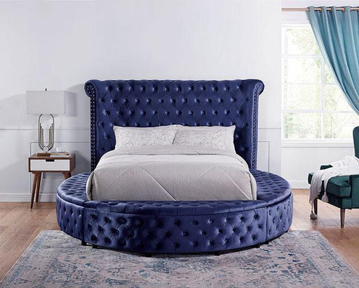The unconventional circular shape of this highly glamorous bed is not the only surprise you can take with you into your master suite! The edges all around the bed have hidden compartmentsone each side and one on the footboard. Soft to the touch, the whole bed is upholstered in velvet-like fabric tufted with buttons. And the headboard stylishly curves along with the circular frame of the bed, with nailhead trim and rolled details reminiscent of the classic chesterfield design.